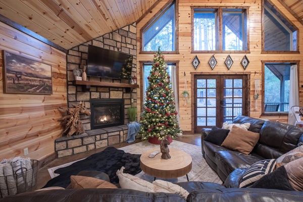 The large covered deck with smart tv and a gas fireplace let's you enjoy the evenings outside listening to nature.